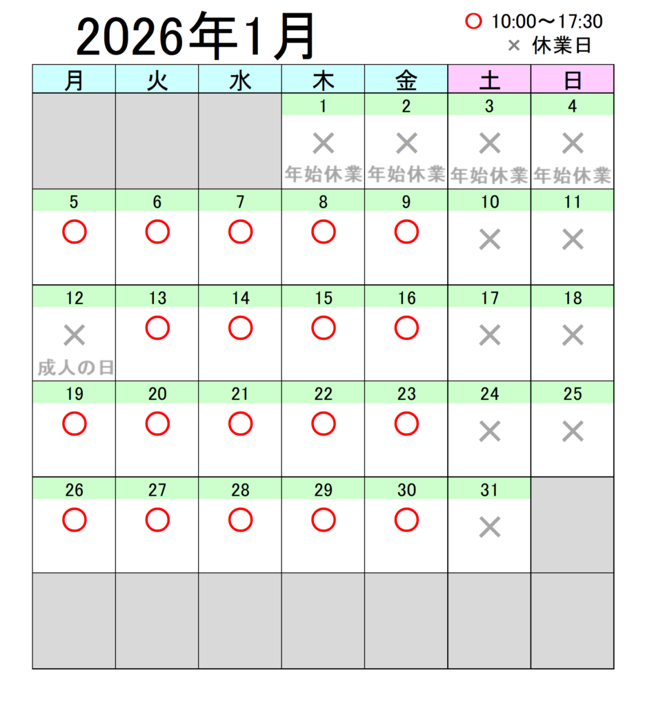 ながくての風法律事務所の2026年1月の営業日は下記のとおりです。